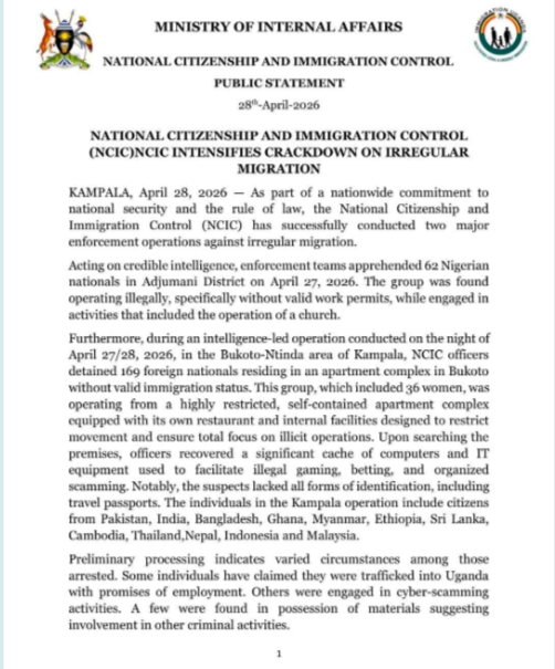 The Uganda’s Ministry of Internal Affairs has arrested more than 231 illegal immigrants, including 62 Nigerian nationals, in two separate intelligence-led crackdowns targeting irregular migration.