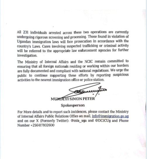 The Ministry reaffirmed it’s commitment to ensuring that all foreign nationals living and working in Uganda are properly documented and comply with national regulations.